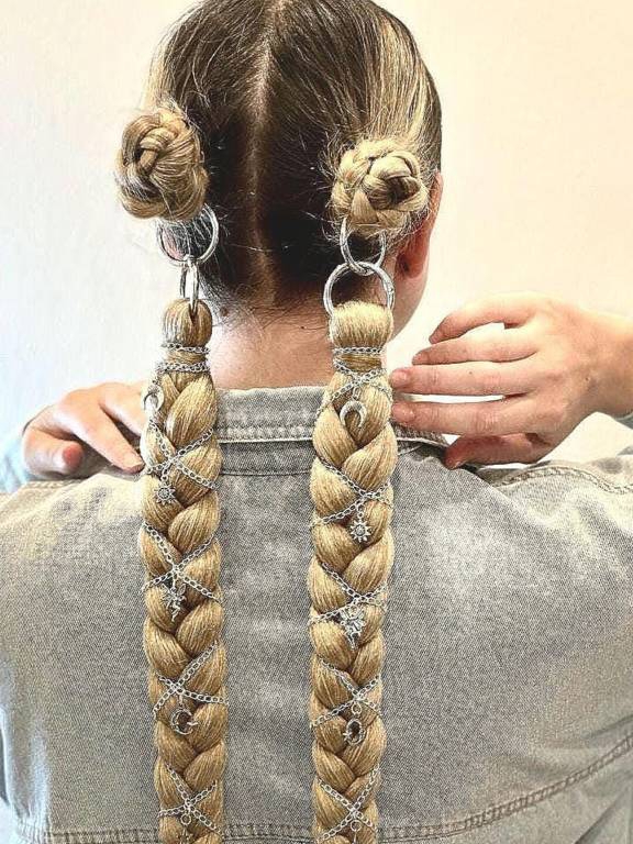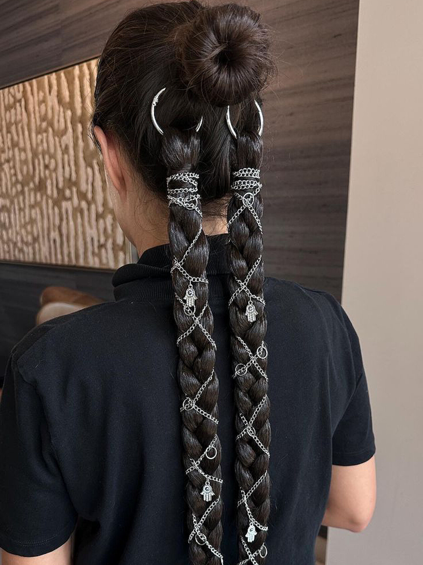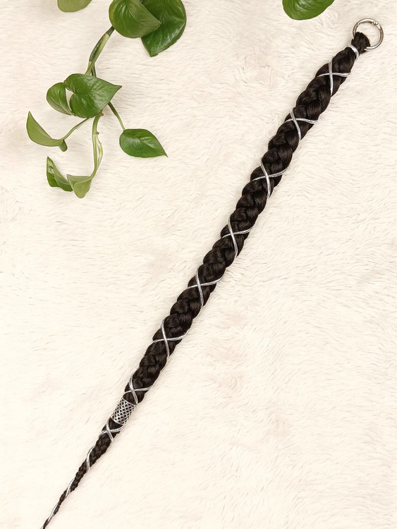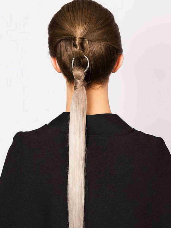 این محصول رو می توان به دنباله ی موهای بافته شده یا موهای دم اسبی شده اضافه کرد(همانند تصاویر)چون دارای حلقه متحرک هست نصب را روی مو راحت کرده و زیبایی و قد موها را بیشتر می کند.